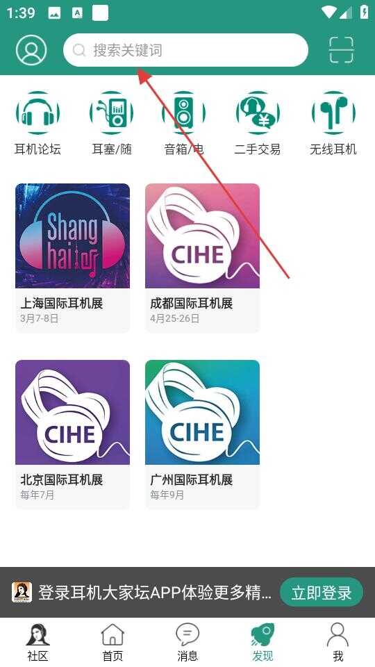 1、进入发现页面点击顶部搜索关键词栏,输入耳机展、耳机型号等内容,查找相关信息,进入对应结果页。