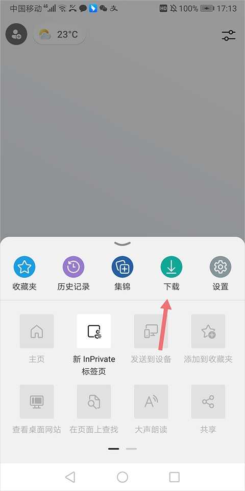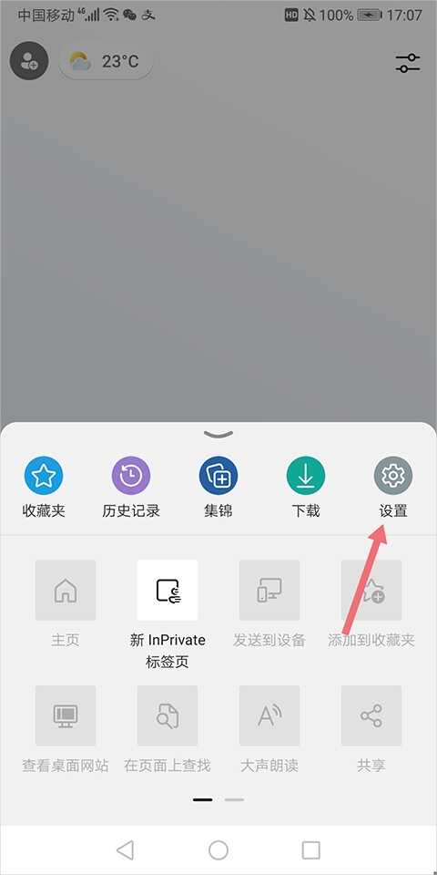 1、点击微软浏览器手机版主页面中右下角的功能菜单图标(下图红色箭头所指)