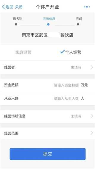 8、填写经营者信息,资金数额、从业人数和场所等等信息,最后(at last)点击提交旣妸;