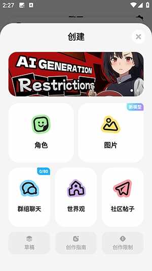1、点击(ji)中间的创建板块,选择要创建的内容。