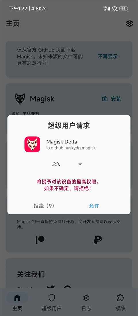 2、下载安装一下(one time)Delta版本(Version)Magisk安装打开,给ROOT权限