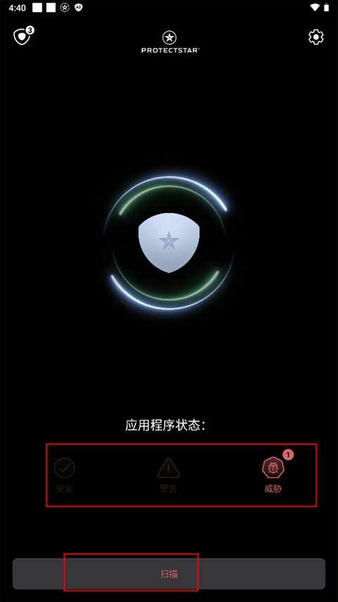 1、打开app,根据用户当前手机的状态显示应用程序的状态,点击扫描按钮。