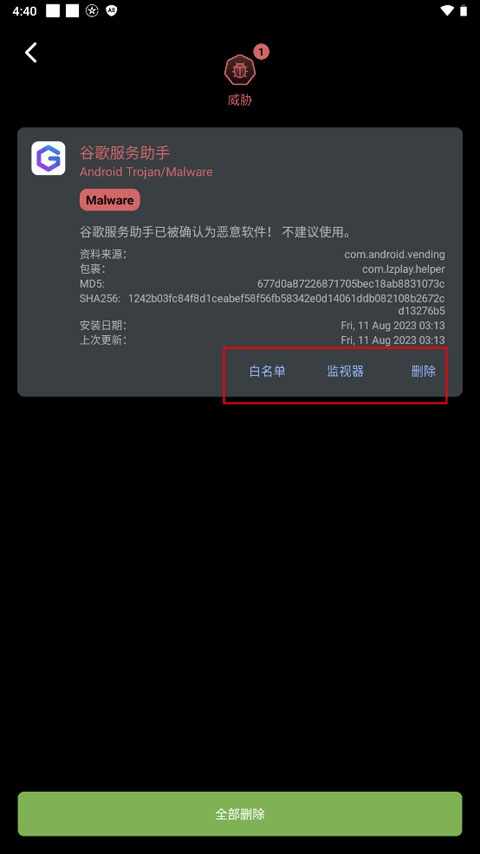 一键清理:用户可轻松通过一键操作,清理手机中的风险应用,确保手机安全。