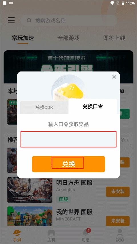 3、从默认兑换CDK切换(huan)到兑换口令,输入你早已得(de)到(dao)的口令号码,全部输入好后点击下方的兑换按钮即可兑换成功(gong)。