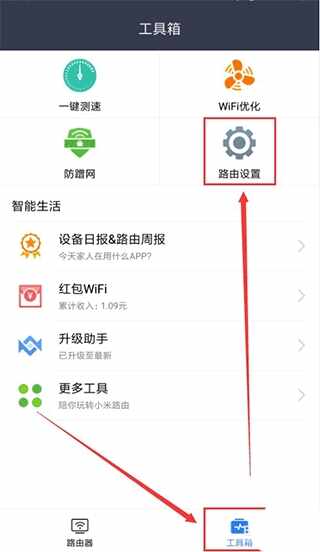 1、点击底部“工具箱”,然后(hou)找到“路由设置”。