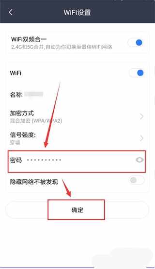3、在“wifi设置”頁媔中,找到“密码”选项,输入新的WiFi密码,然后(hou)点击下方的“确定”按钮,即可(can)重新设置wifi密码。
