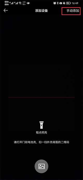 二、打开门锁电池壳,扫描外壳背面的二维码就可以绑定设备了,若扫描不了,可以点击右上角手动添加设备