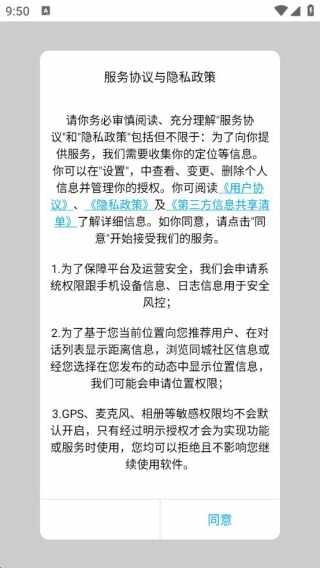 1、下载安装软件后打开,弹出服务协议与隐私政策,点击(ji)同意。