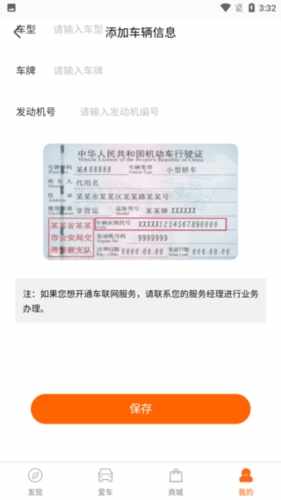 3、依次输入车辆车架号、车型、车牌、发动机号,然后点击(ji)保存即可连接车辆。
