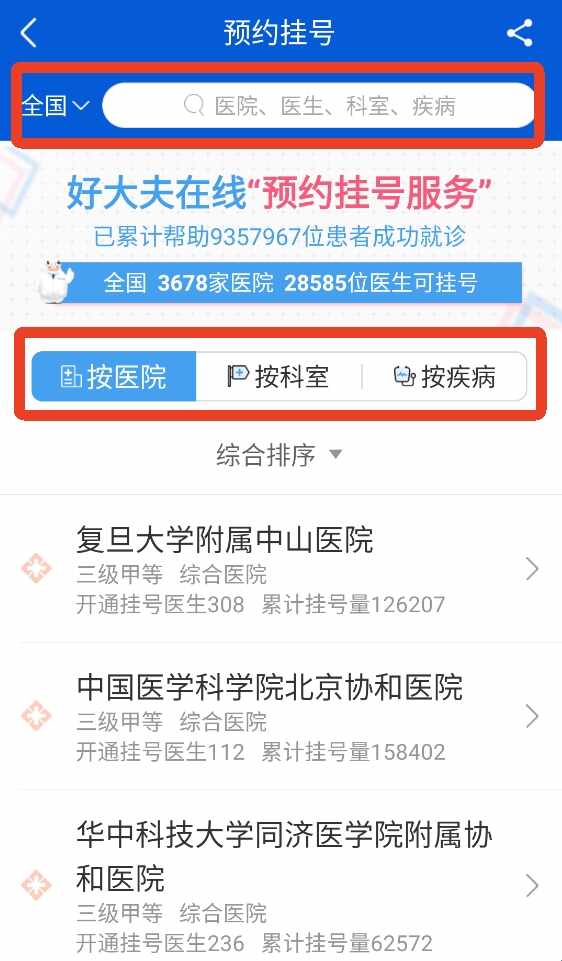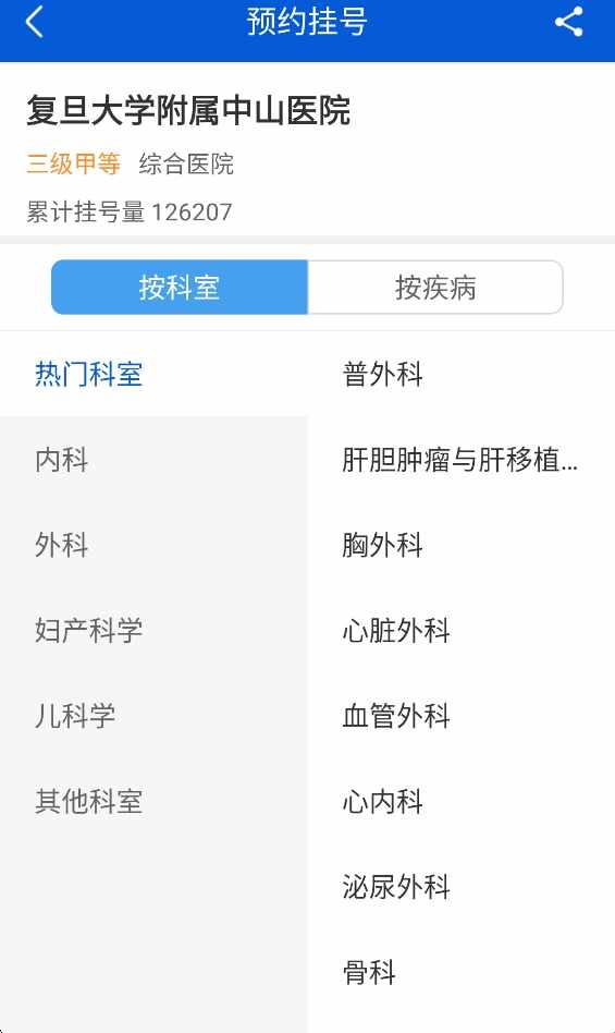 2、选择一家医院,你可以选择地区进行搜索,或者按医院、科室和疾病进行查看。