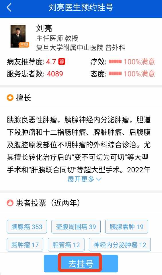 5、找到你想挂号的医生点击后,会有(there will be)更加(gengjia)详细的信息,之后点击下方的【去挂号】。