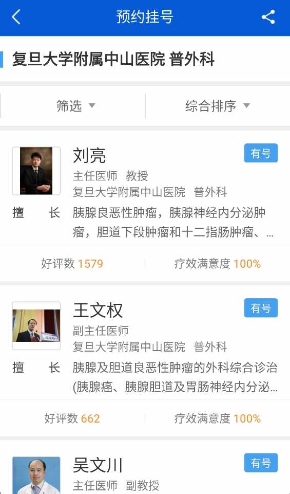 4、会显示该医院所有相关疾病有关的医生,你可以看到他们的好评数和疗效满意度。