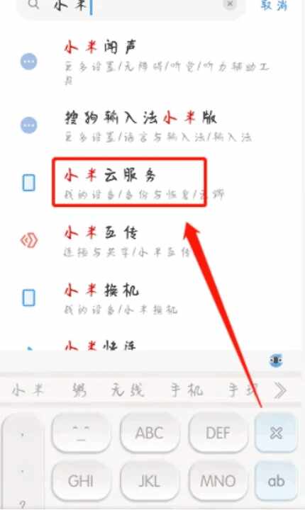 2、搜索小米云服务并选中它。
