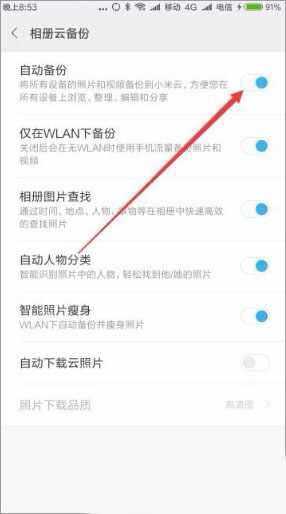 5、这时同样可以打开相册云备份页面,同样点击“自动备份”菜单项后,就会关闭了小米相册的云备份功能了