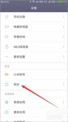 2、这时会打开小米手机的设置页面,在页面中点击“同步”菜单项;