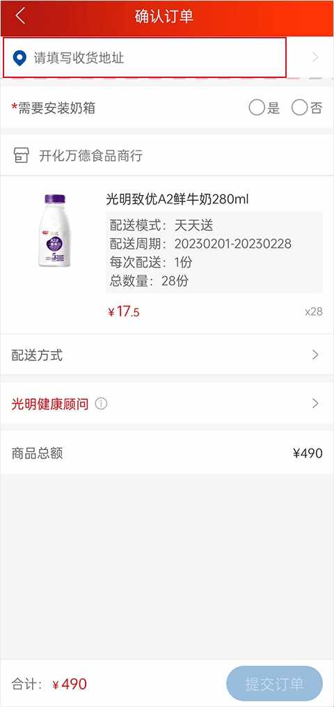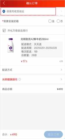 5、填写你的(your)收获地址,点击提交订单即可(can)完成牛奶预订。