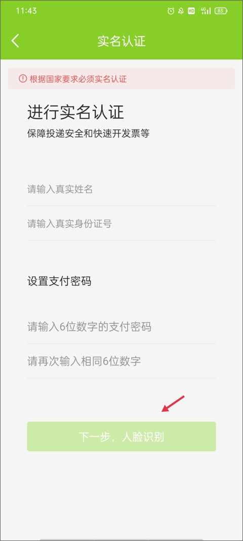 3、开始准(zhun)备(bei)进(jin)行(xing)实名认证操作,输入自己真实姓名、真实身份证号、支付(to pay)密码,然后进入下一步“人脸识别”。