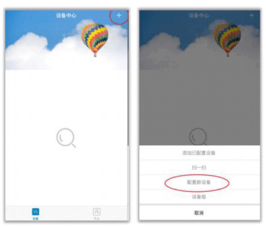 打开已下载安装好的优e家软件,点击界面右上角的“+”号,选择“配置新设备”。