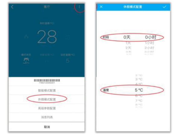 休假模式配置:点击主界面右上方的设置按钮,选择“休假模式配置”,滑动(dong)选择休假时间和休假温度,点击“√”确定。在休假期间,温控器会按照(according to)设定温度运行。
