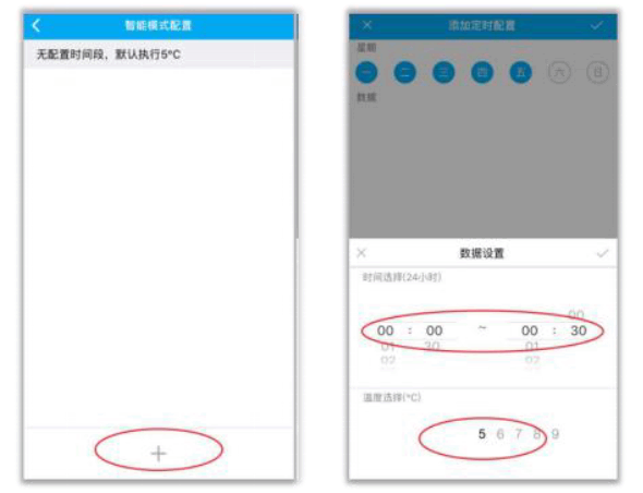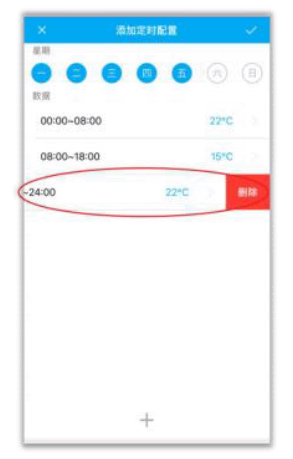 智能模式配置:点击“+”,依次设置对应的星期、时段以及该时段对应的温度,设置完成后点击“√”保存。例如,可设置00:00 - 8:00温度为22°C,8:00 - 18:00温度为15°C,18:00 - 24:00温度为22°C,这样就对应了三个(sange)时段。如果时段配置出现错误,可按住错误时段并向左滑动(dong),删除该时段。