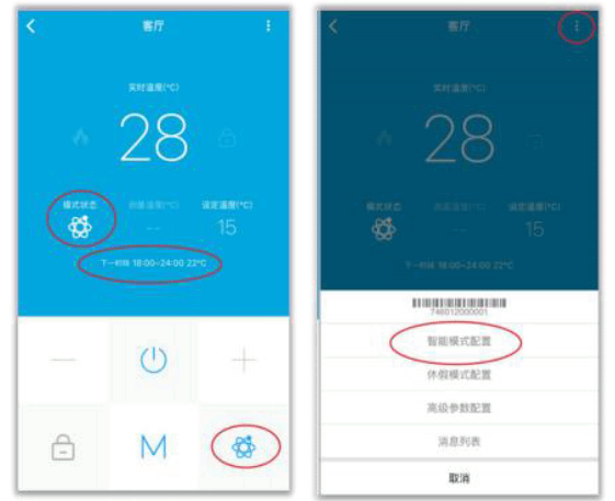 当温控器处于智能模式时,会有特定的显沶状态。可(ke)以(yi)通过界面中“智能模式”按钮,或者在选项界面选择“智能模式配置”选项,来配置智能模式时段。