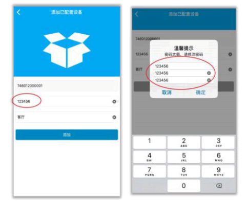 在对话框中输入初始密码“123456”,编辑设备名称,然后点击“添加”按钮。