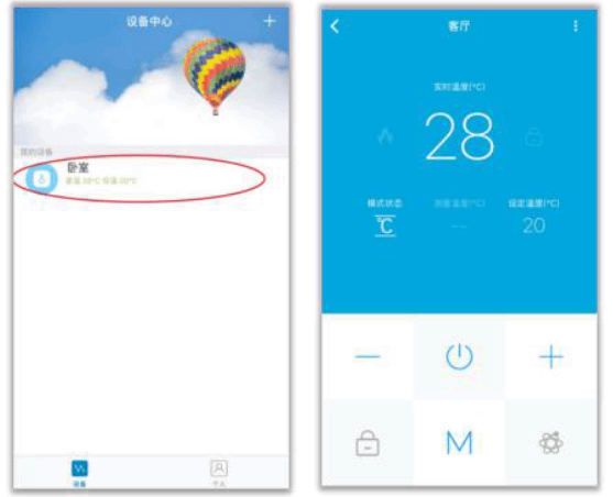 在主界面,可(ke)以(yi)随时选择开启或关闭设备,实时监控家中温度。
