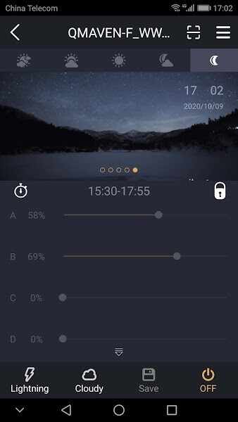 LED LIGHT:控制亮度,持续时间,天气模式,月相,适應,睡眠模式,演示模式。通过QR码共享灯光设置。