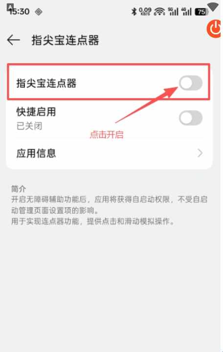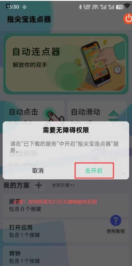 2、进入主页,打开"自动(zidong)点击",提示(tishi)需要开启无障碍权限,即是使用前首先打开无障碍服务权限。