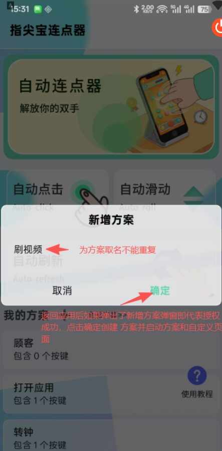 7、返回应用后如果弹出了新增方案弹窗即代表授权成功,点击确定创建(chuangjian)方案并启动方案和自定义页面。
