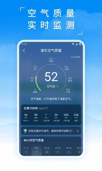 3、实时空气质量监测:提供未来48小时及15天空气质量预报;实时更新(renew)空气质量、PM2.5等指数预报。