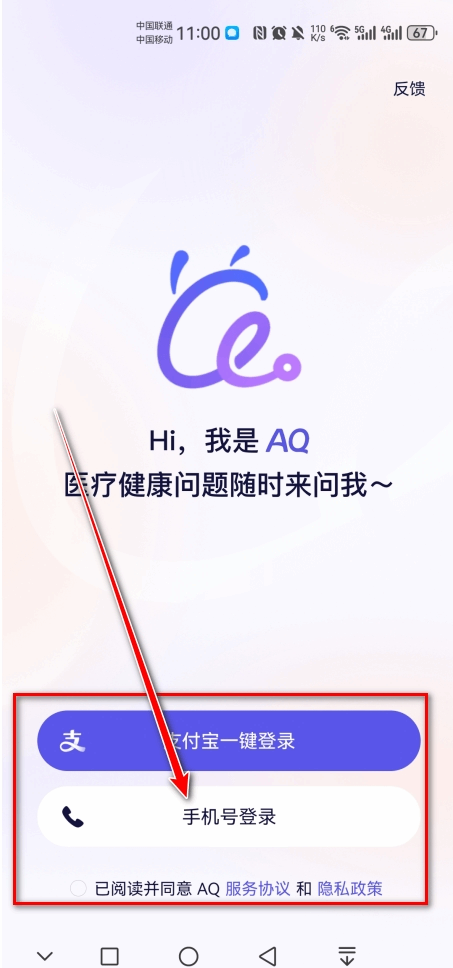 1.打开(Open)AQ,可以看到本软件支持支付宝一(yi)键(jian)登录或者手机号登录,在這裡小编以点击(dianji)手机号登录为例。