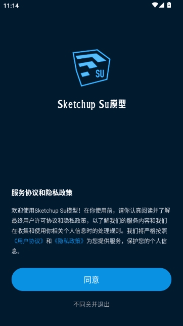 1、启动Sketchup Su模型app,阅读并同意服務协议与隐私政策,点击“同意”琎叺应用。