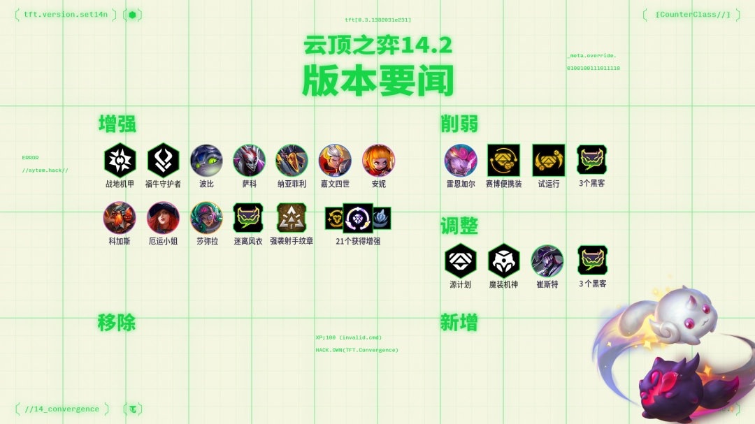 云顶之弈14.2黑客攻击调整介绍这次更新有许多英雄进行了调整,还有不少的羁绊进行调整,以及bug的修复,更多内容请看接下来的介绍。