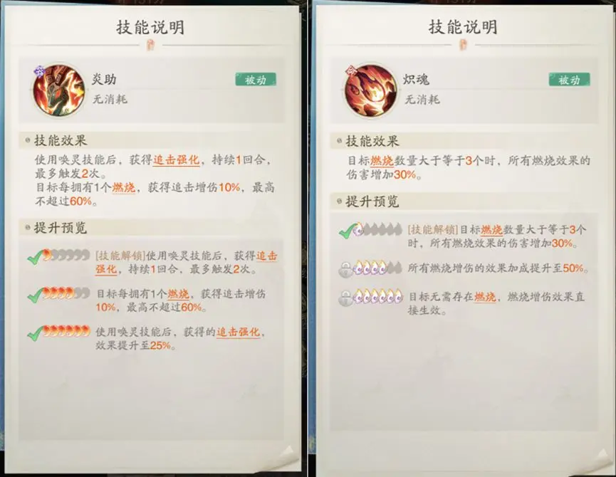神通推荐:中期可以选择:5阶业火焚心、5阶混元一气、5阶离火炙焰、6阶幽冥绝影、7阶封天神炎,后期可以将离火炙焰换成7阶天鼓引雷,这样就每个技能(skill)都能带有燃烧效果,伤害更高。