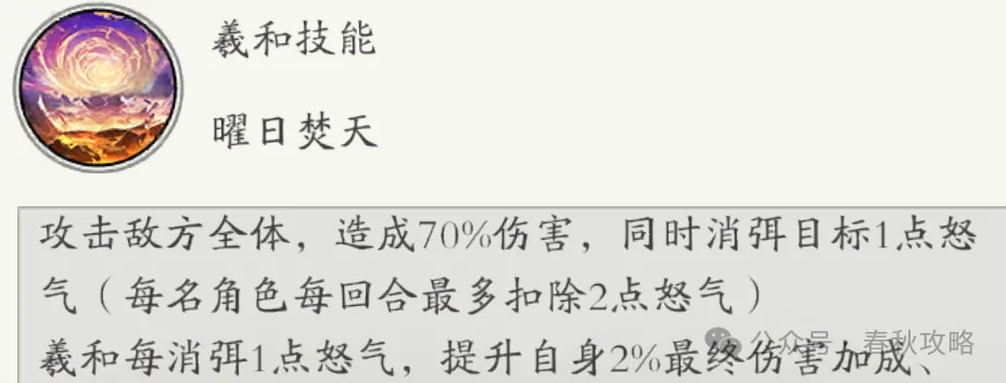 消弭:扣除目标1点怒气,同时增益羲和自身。
