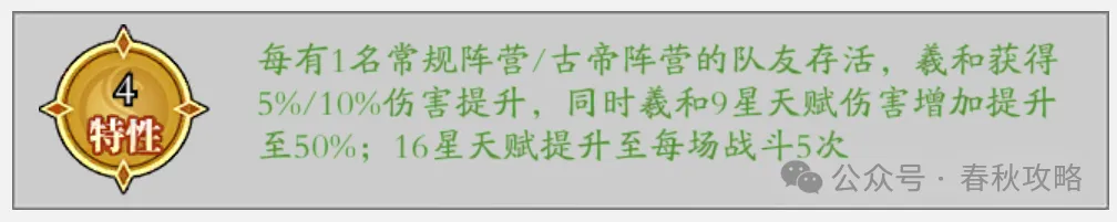 然后特性4,根據队友阵营得到伤害提升(promote),算上羲和6古帝高达50%,对盾伤害增加为50%(破盾更猛了),阵亡时放技能变成了5次,这下复活多的兄弟们也能打更多次伤害了。是拥有多次复活次数兄弟们的必需品。