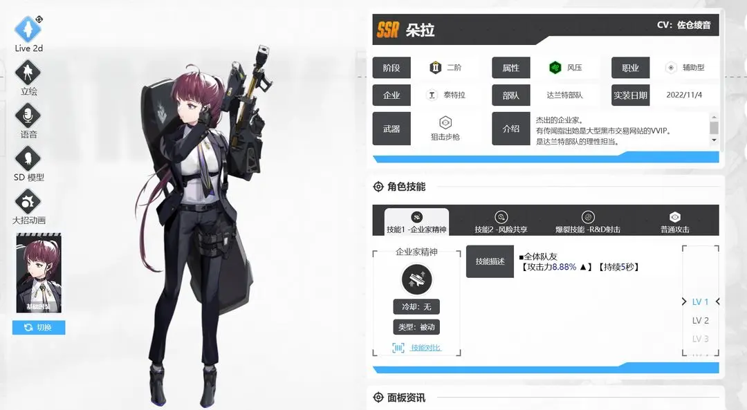 丽塔 :SSR 级辅助角色,冲锋枪持续输出,提供全队攻击加成(addition)与群体治疗,弹药量与换弹速度出色,泛用性强,适用于主线推图、防守战、高难副本等多种场景,是开荒与高难本必备角色,被称为 “人权卡”,开服首抽必争。