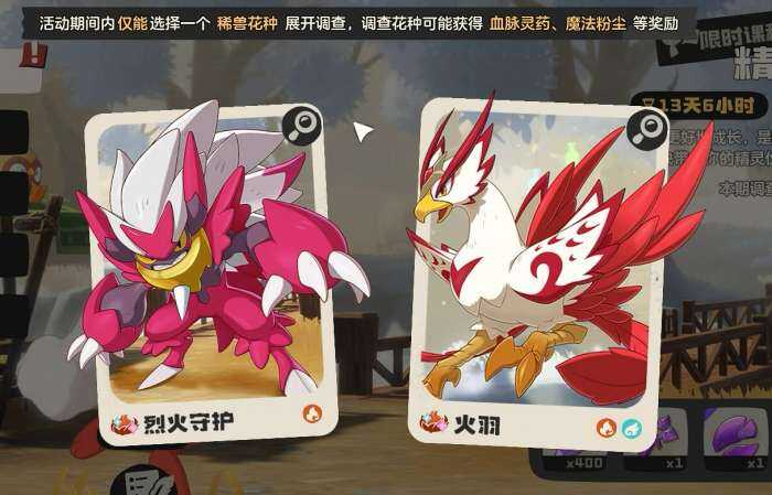 烈钻鸟之所以会稀有,是因为它没办法直接在世界里抓取,而是要等开放对应的火系精(jing)灵调查活动后,各位(everybody)才能获得捕捉烈钻鸟的机会。具体的捕捉方法如下,当精(jing)灵调查开启后,各位(everybody)可在两种可进行调查的精(jing)灵中选择火羽(烈钻鸟最(zui)终形态),再去找老师走完活动任务,就能正式开启精(jing)灵调查了。此后,火羽的稀兽花种会被标注在地图上,各位(everybody)根据指引来到它的所在地,交互祈愿后稀兽花种就会出现。