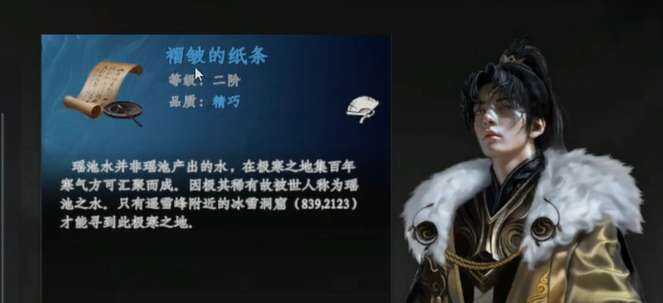 第二种材料是瑶池水,获取此物品的过程相对较为复杂。在你完成“72福地龙脉解迷”的任务后,需要前往云鹤村。此时,村中有一位老人不慎落水,救起她后,她会告知一个坐标(839,2123)。前往此坐标后,你即可获得瑶池水。值得注意的是,若你在游戏前期没有救起这位老人,她将不会出现在水中,这时你可以通过提供50万银两或(huo)者(zhe)施加武力来迫使她透露坐标。