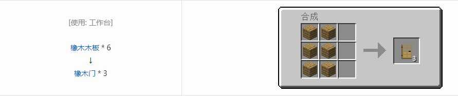 1.8之前六个木板只能做一个门,且不论什么木头都得到(get)橡树门。1.8后六个木板可以得到(get)三个门,且随木材种类(lei)变化(bianhua)(不能混合)