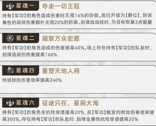 持有[军功】的角色造成(zaocheng)伤害时无视16%的防御。若已升级为【爵位】,则该角色的战技伤害额外无视20%的防御。刻律放战技时,为目标恢复(recover)2点能量。
