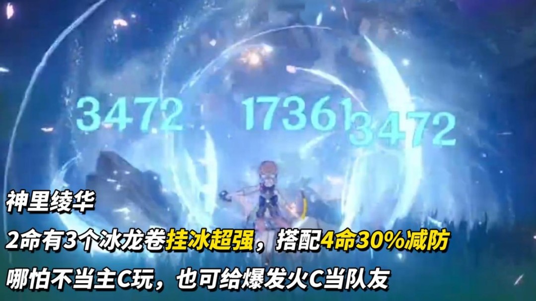 神里绫华4命提供30%减防,搭配上2命额外两个小旋风,可作为火C挂冰融化与增幅的选项;