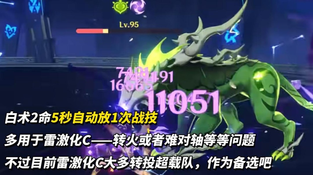白术2命,每5秒自动放1次战技,一定缓解解决了雷激化C挂草难转火难等等问题。不过目前雷C大多转投减抗增攻更轻松的超载队伍,已经很少玩雷激化体系了,可作为备选之一;