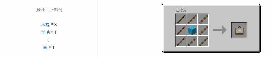 画可使用 8 根木棍和 1 块羊毛合(he)成获得(huode),每次(meici)合(he)成时获得(huode) 1 个。