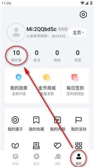 1、首先我们(men)在打开小米社区后,可以看(kan)到最下方的四个选(xuan)项,点击右下角“我的”,并选择“成长值”,如下图;