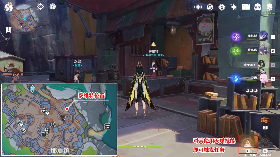 在下图所示位置的「秘谜书屋」处,使用奈芙尔对店主萨维特使用天赋(fu)技能(jineng),即可获(huo)得(de)一份「已记载的情报」,并触发世界任务「小生意」。