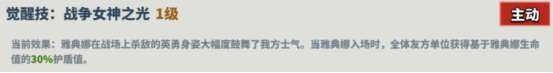 描述:雅典娜在战场上杀敌的英勇身姿大幅度鼓舞了我方士气。当雅典娜入场时,全体友方单位获得基于(jiyu)雅典娜生命值的30%护盾值。