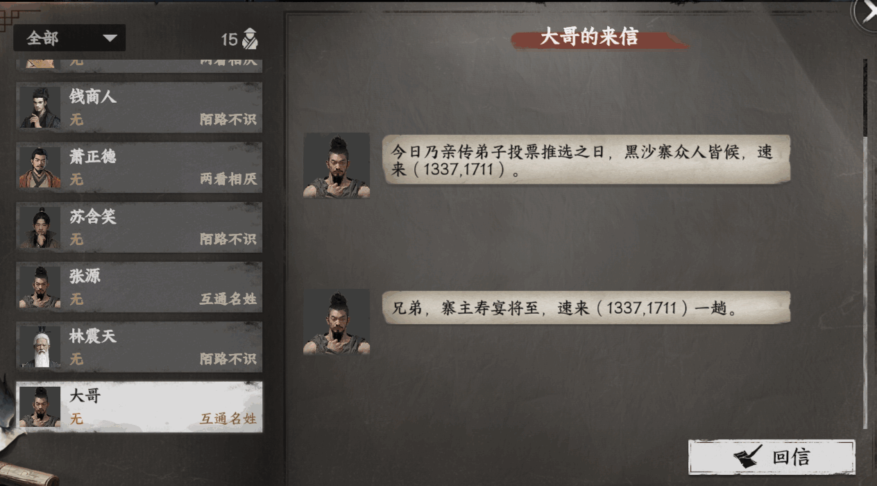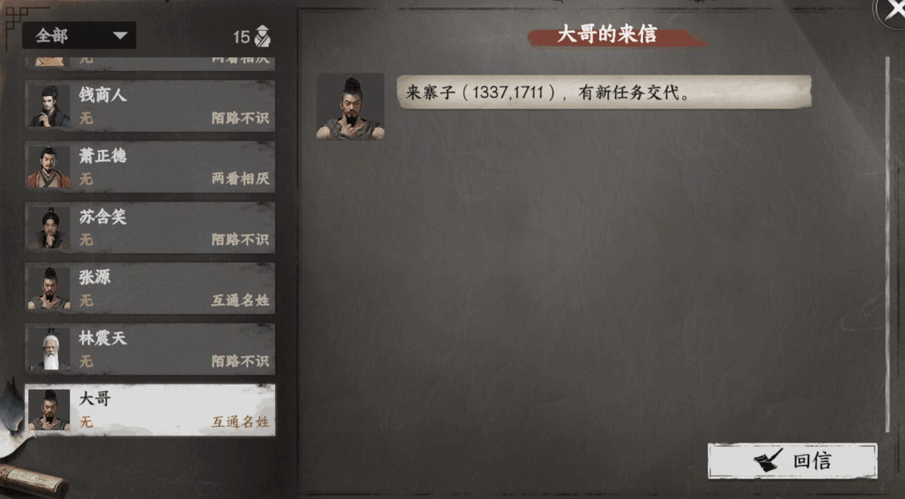 做悬赏任(ren)务(wu)将门派(menpai)好感提升到25时收到(receive)张源飞鸽