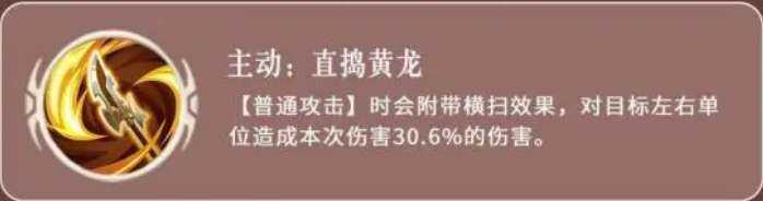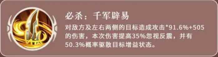 这个技能使用的时候,可以对敌方以及他左边和右边两个敌军的目标,一共3人造成攻击,攻击数值的话,基础(Base)的是有91%的数值,然后加上505的固定数值,那么这一次的伤害后期还可以提升35%的忽视效果,这里忽视的效果一般(generally)是针对于反震的,并且同时还有50%左右的概率,可以去驱散掉敌人身上的一些增益状态,不过驱散的数量不多,那么他在被动上面有一个折冲防御的效果,这个折冲防御也是针对于忽视反震的效果,触发的时候带来的效果是很不错的。
